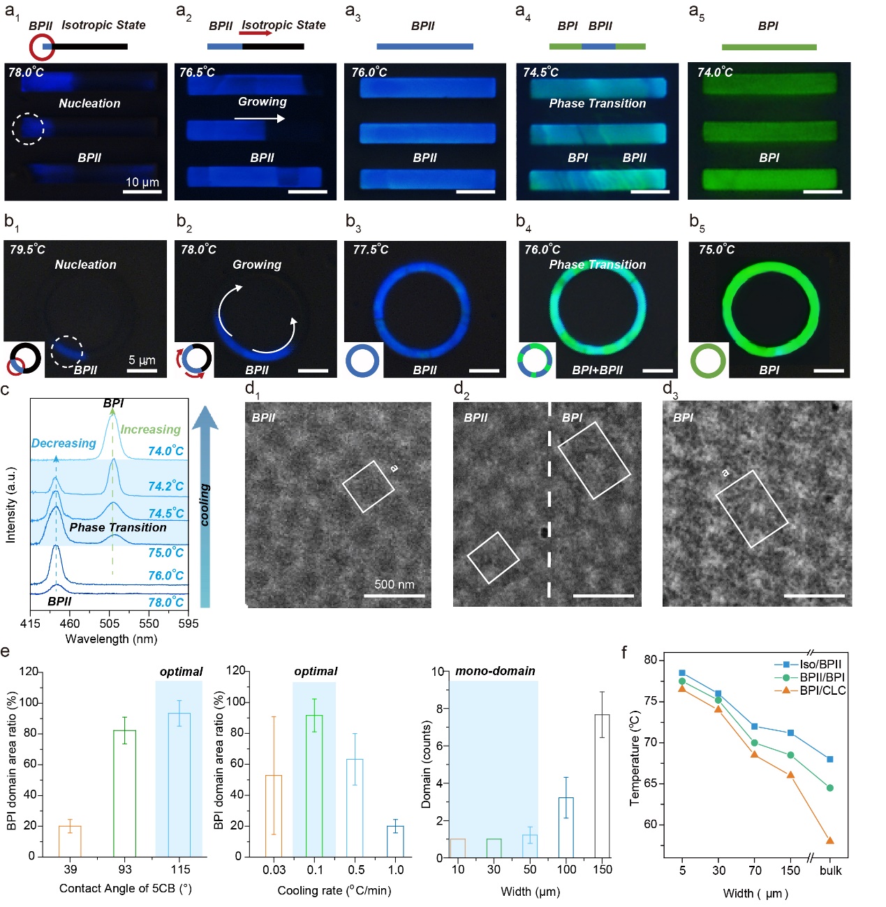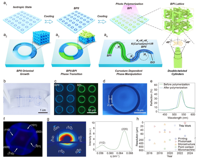 蓝相液晶(BPLCs)是以双扭柱结构为基本组装单元自组装形成的三维立方晶格超材料,展现出独特的手性光学、全向光子带隙与快速电光响应特性,在超快显示、可调谐激光器及集成光子学领域前景广阔。实现蓝相液晶在微纳尺度上的精确图案化、单畴控制及相态操纵,是将其优异光学性能转化为高性能光子器件的关键,然而传统方法在分辨率、畴区质量与相态精确调控方面面临严峻挑战。