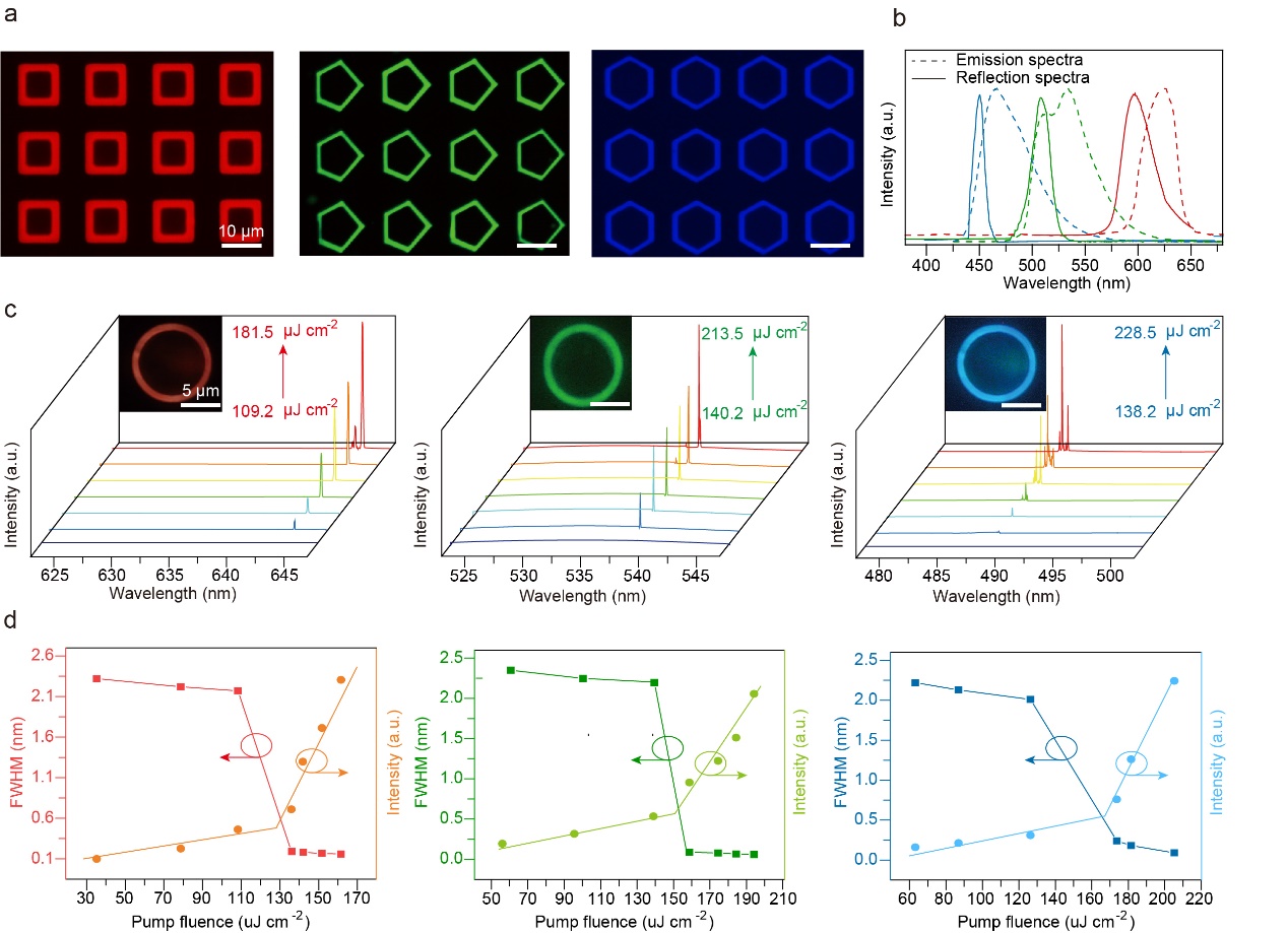 基于此原理,研究团队成功制造了分辨率达1270 PPI的单畴BPLC微腔阵列,阵列表现出均匀的光学特性与优异的激光性能,阈值低至128 μJ cm⁻²,品质因子(Q值)高达约1.3×10⁴。尤为重要的是,他们利用曲率对相态的差异化调控能力,一次性在同一基底上集成了具有不同相态(各向同性态、BPII、BPI)的复杂图案。