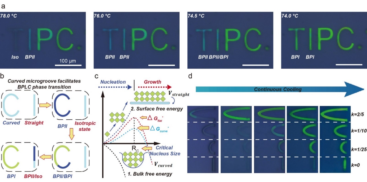 该团队提出了一种软限域组装(SCA)的方法,通过设计一系列具有精确微沟槽结构的聚二甲基硅氧烷模板,利用其空间限域效应引导BPLCs的定向成核、生长与组装。研究发现,微沟槽的几何限制不仅能精确控制BPLCs的成核位点与排列,其曲率更成为调控相变动力学的关键参数。弯曲沟槽能显著降低BPLCs从BPII到BPI相变的成核能垒,从而在相同降温条件下,实现比直沟槽更快的相变速率,这一发现为通过“曲率编程”来精确控制材料局部相态提供了全新原理。