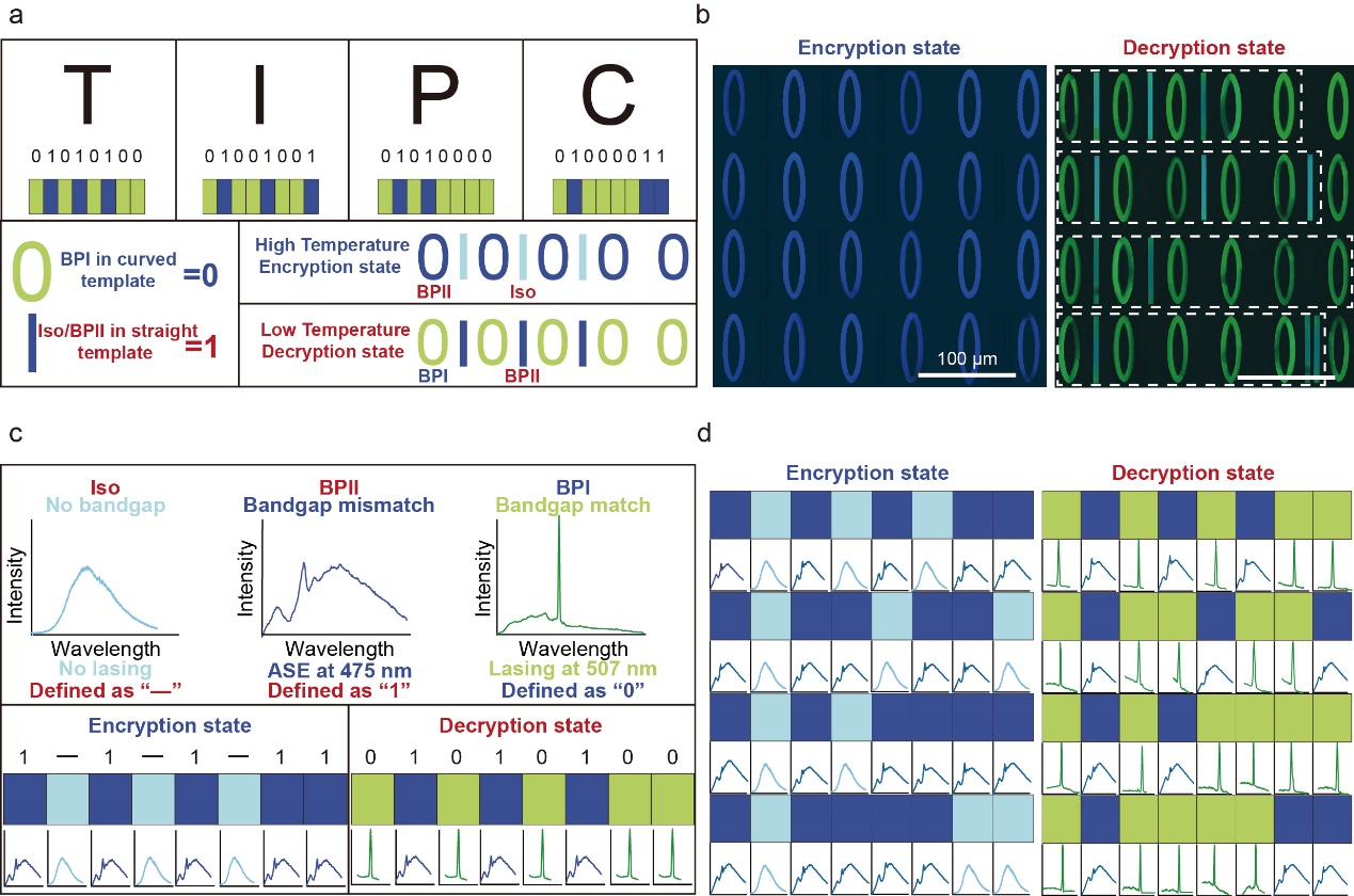 以此为基础,团队开创性地展示了一个四模态光学加密系统。该系统将信息(如“TIPC”字样)编码于不同曲率的微沟槽中。在初始高温(加密)状态下,仅部分区域显示BPII的蓝色结构色,信息被隐藏。随着温度降低(解密),不同曲率区域发生异步相变,最终呈现出由绿色(BPI)和蓝色(BPII)区域组成的预定图案。同时,不同相态区域对应着截然不同的激光信号(无激光、放大自发辐射、激光),构成了第四重动态验证维度。这种融合了形貌、相态、颜色与激光的多维信息加密方案,极大地提升了防伪的安全等级与复杂性。