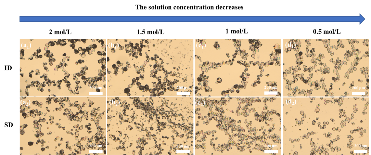 图3 不同浓度和不同收集位置(ID:塔底收集,SD:旋风分离收集)的HAMs的光学显微镜图像(透射光模式)
