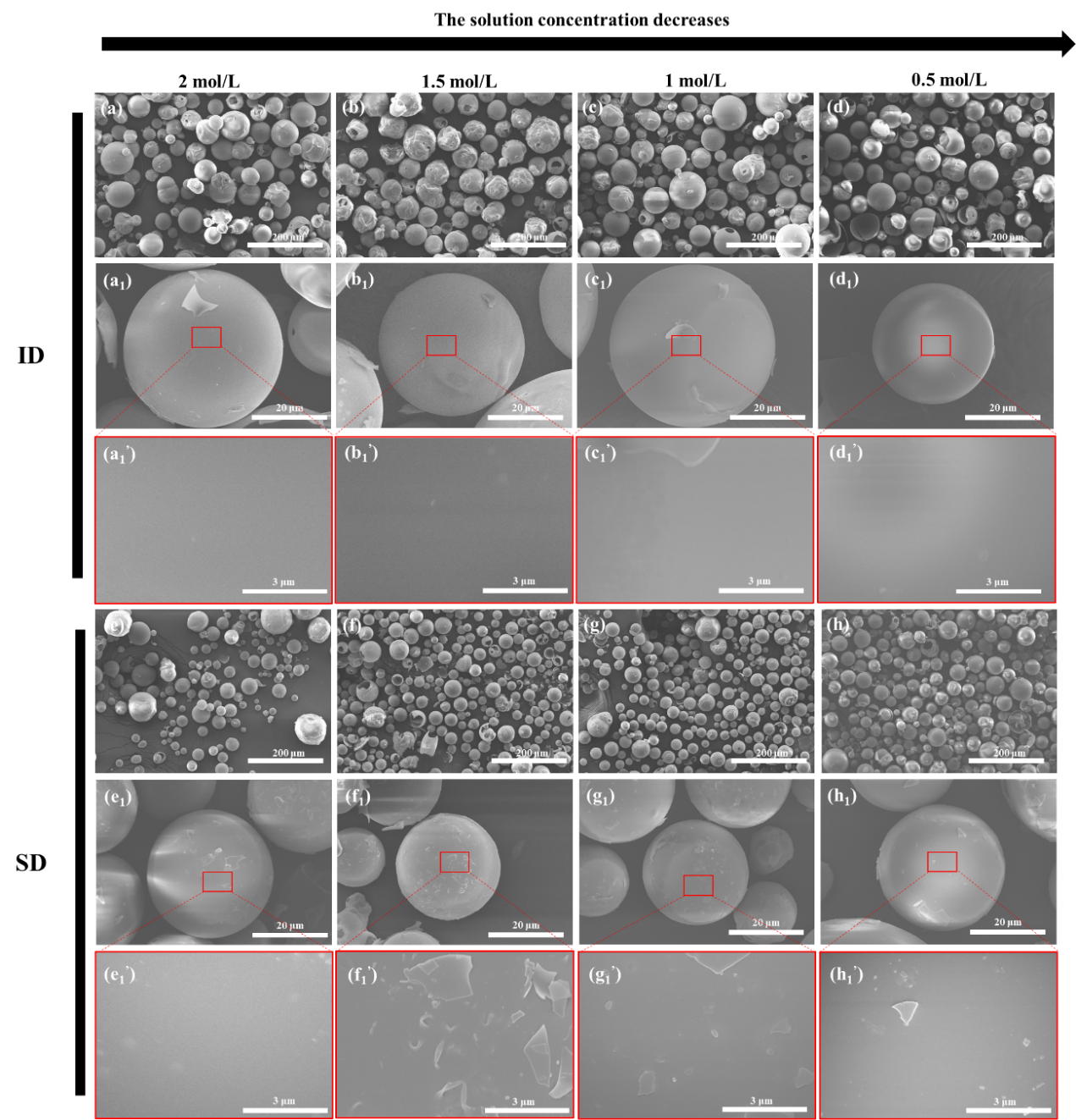 图4 不同浓度和不同收集微球的HAMs的多球、单球、表面放大的电子显微镜图像