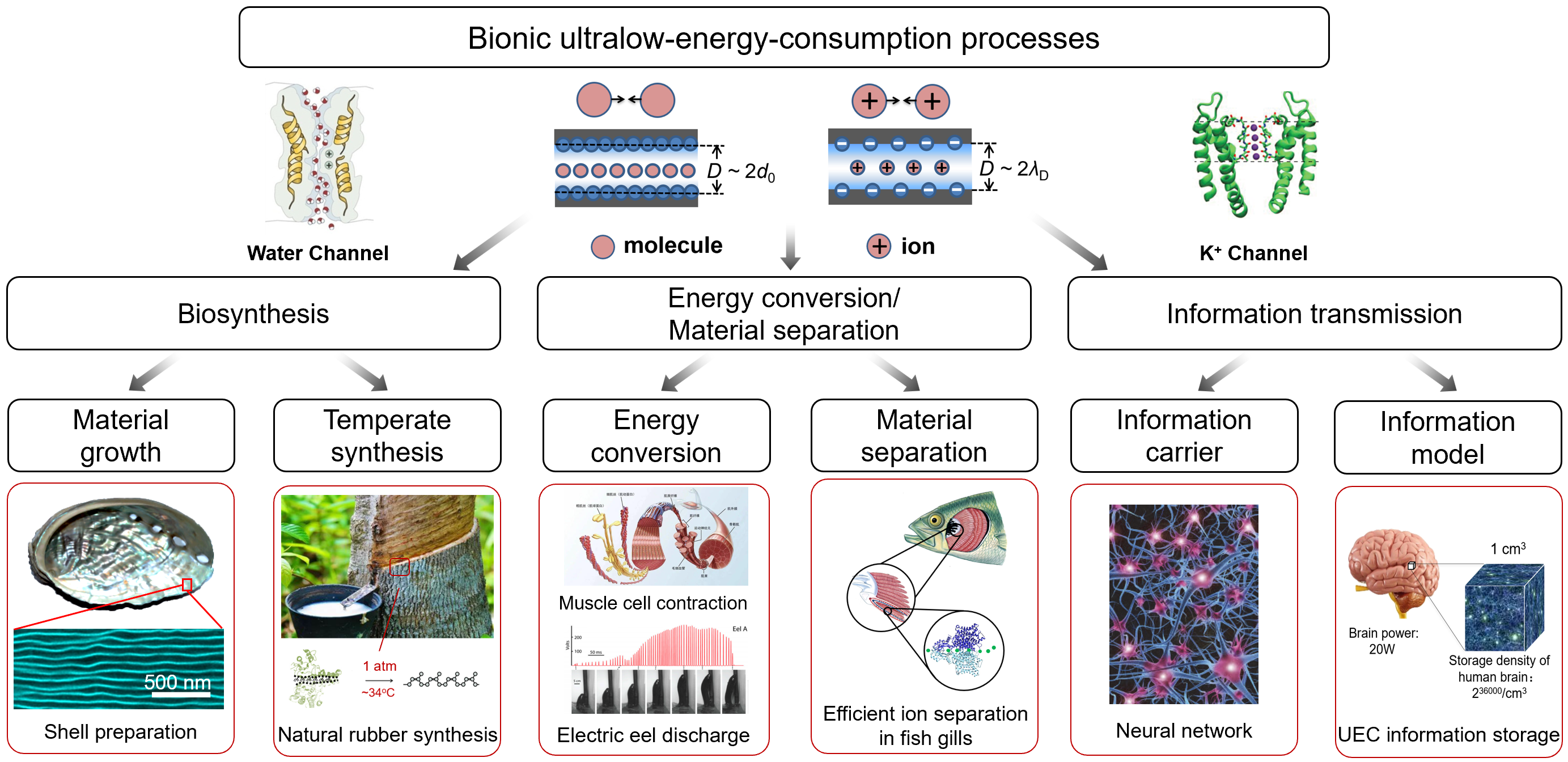 另一方面,动态超浸润性是指液体在具有纳米结构的二维表面上的超铺展特性,或通过一维微孔或微锥的定向流动特性,甚至是生物或人工纳米通道中离子或分子的超高通量特性。基于对动态超浸润性的研究,研究团队提出了生命科学领域中的关键科学问题:即生命体系是如何实现超低能耗的物质合成、能量转换和信息传输?实验和理论研究表明,生物纳米通道中离子或分子的有序定向集团运动是实现超低能耗过程的物理化学本质。文章进一步列举了仿生超低能耗体系在材料制备、温和合成、能量转换、物质分离、以及信息处理和传输领域的一些应用。文章在最后提出了仿生超低能耗过程研究的未来挑战,包括利用基因编程技术制备人造生物陶瓷、中红外光化学合成、人工肌肉和微动能发电、重水和水分离、信息收集、存储和输出等。