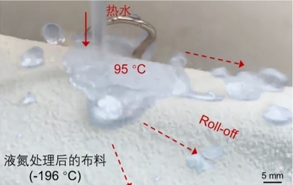 极端温度耐受性实验显示,MARS织物具备优异的热稳定性。无论是刚煮沸的开水或9bar压力胶囊咖啡机挤出的咖啡,均无法破坏其超疏水状态。即使经过160°C高温熨烫处理,其超疏水特性仍丝毫未受影响应。甚至在95°C热水与-196°C液氮的极端冷热循环冲击下,织物性能依旧稳定。