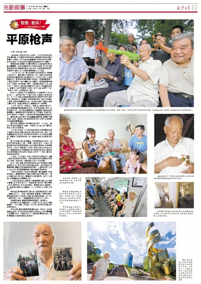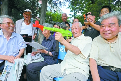 ▲韩雅泉家住海淀中关村中科院家属区,很多邻居都是老八路、老解放。楼前广场上,小朋友们请爷爷讲打鬼子的故事。他端起玩具枪一边瞄准一边讲起马庄子伏击战的经历。