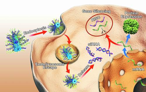 在RNA干扰技术中,病毒类基因载体及非病毒类基因载体具有各自的优势及局限性。病毒类基因载体具有自然界所赋予的高转染效率,但是其毒性及免疫原性副反应大大阻碍了它的发展;非病毒基因载体(脂质体类载体和阳离子聚合物类载体)无免疫原性,且可以通过分子设计利用多种相互作用构建多功能组装结构,然而一直以来,其基因转染效率无法与病毒类载体相媲美。