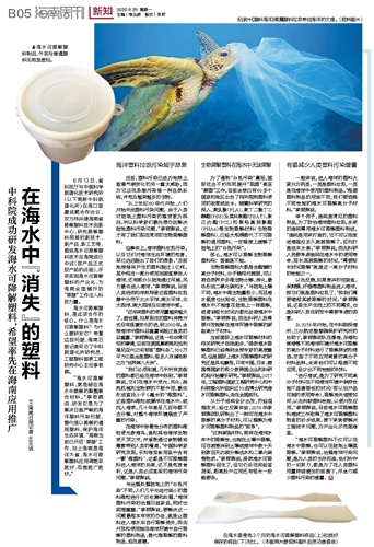 “海水可降解塑料,就是能在海水中降解的聚酯复合材料。”季君晖说,研发它是为了解决日益严峻的海洋塑料污染问题,替代难以降解的通用塑料,保护海洋生态环境,“海南当前已开启‘禁塑’工作,加上海南是海洋大省,海水可降解塑料应用得越早越好,范围越广越好。”