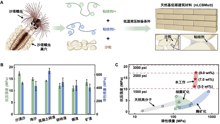 受沙塔蠕虫启发,王树涛研究员团队运用仿生策略,引入正电性季铵化壳聚糖与负电性海藻酸钠形成仿生天然粘结剂,实现了对于沙粒、矿渣等各类固体颗粒的牢固粘结,并最终在低温常压条件下形成高强度低碳建筑材料。