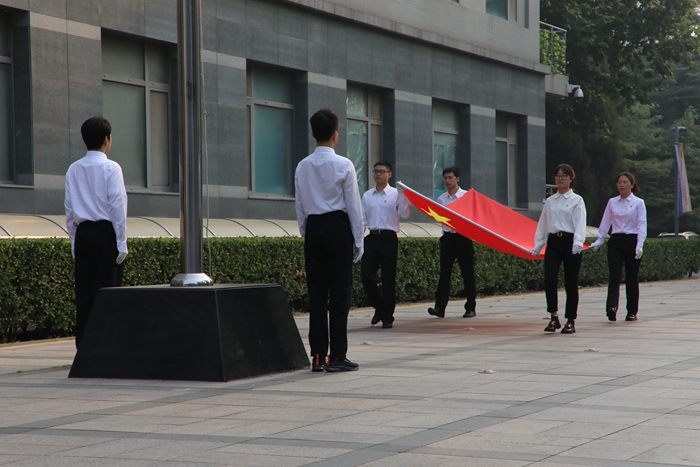 在雄壮激昂的进行曲中,护旗手王静、郑金晓、孔琳和钱威迈着整齐的步伐,护送五星红旗入场,把国旗庄重地交到升旗手李嘉豪和张立军手中。伴随着雄壮激昂的《义勇军进行曲》,在场全体人员高唱国歌,肃立向国旗行注目礼,五星红旗在理化所的上空冉冉升起。