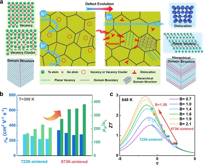 图1. 缺陷结构演化实现对电声输运性能的协同调控。(a) 缺陷结构演化调控电声输运特性示意图;(b) 873 K烧结样品的加权迁移率及加权迁移率和晶格热导率的比值与723 K烧结样品的对比;(c) 648 K温度下ZT值与简约费米能级及不同品质因子的关系