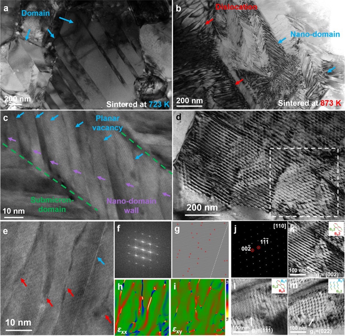 图2. 空位诱导缺陷结构演化的TEM表征。(a,b) 723 K和873 K烧结温度下样品的形貌对比;(c)在(b)图中随机选取一处展示出的纳米畴结构的高分辨TEM图;(d) 一处在873 K烧结样品中观察到的位错网络;(e-i) 随机选取的一处带有位错和空位层缺陷的高分辨TEM及其FFT、IFFT和应变分布图;(j-m) 位错网络的选取电子衍射图及不同g矢量(衍射矢量)方向下的形貌图。