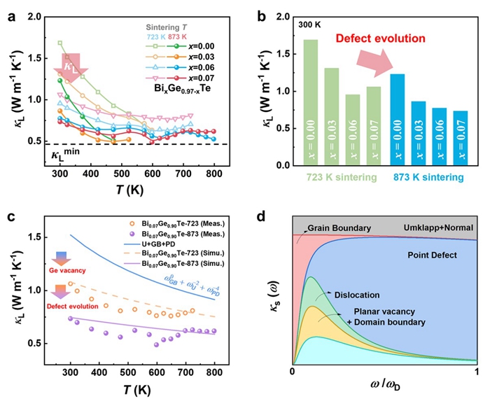 图3. 缺陷结构演化对热导率调控的机理。(a)不同温度烧结样品的晶格热导率随温度的变化图;(b) 873 K烧结样品的室温晶格热导率与723 K烧结样品的对比;(c) Debye-Callaway模型计算得到的缺陷演化对晶格热导率的贡献与实测样品晶格热导率很好吻合;(d) Debye-Callaway模型计算的不同缺陷对声子散射的贡献。
