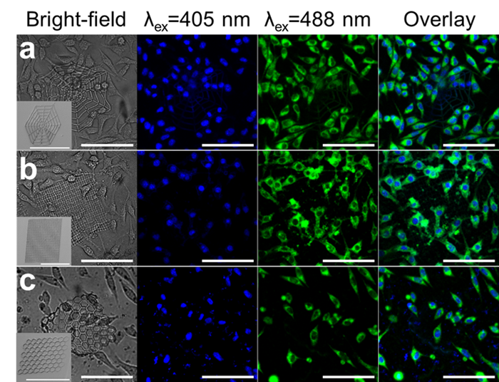 3. 3D细胞支架与L929细胞共培养的明场及共聚焦荧光图像