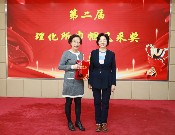 随后举行第二届理化所巾帼风采奖颁奖仪式。张梅英宣布了获奖结果,并通过视频短片介绍了王京霞、王格侠、李华、李嫕、高波等五位获奖者的优秀事迹。张丽萍书记为每位获奖者颁发了获奖证书和奖杯,并与获奖同志合影留念。