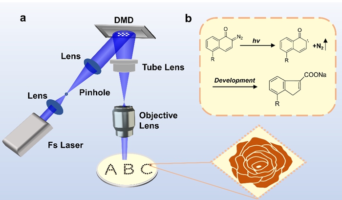 图1. 飞秒激光无掩膜投影(MOPL)光路示意图及AZ P4620正胶的光化学反应