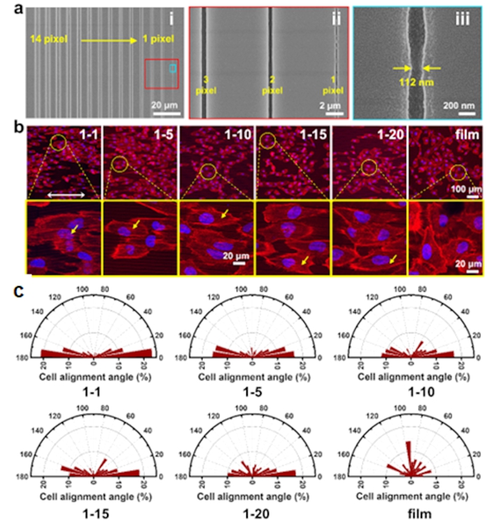 进一步地,受血管和皮肤内表面定向排列结构的启发,得益于MOPL技术的灵活性和高效性,我们分别制备了凹槽宽度为1 m,脊线宽度分别为1、5、10、15和20 m的大面积沟槽阵列结构。通过荧光染色观察发现,细胞在一系列沟槽阵列结构上形成了沿沟槽方向的肌动蛋白纤维束(图3b),细胞沿着沟槽取向排列。然而在平面基底上,细胞肌动蛋白纤维束的方向是随机的,细胞随机排列。不同尺寸参数的大面积沟槽阵列拓扑结构对细胞行为产生了明显的调控作用。
