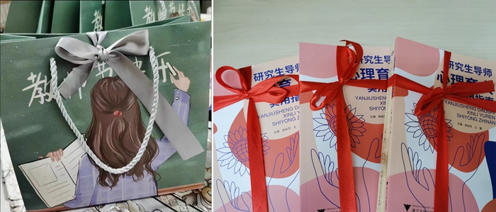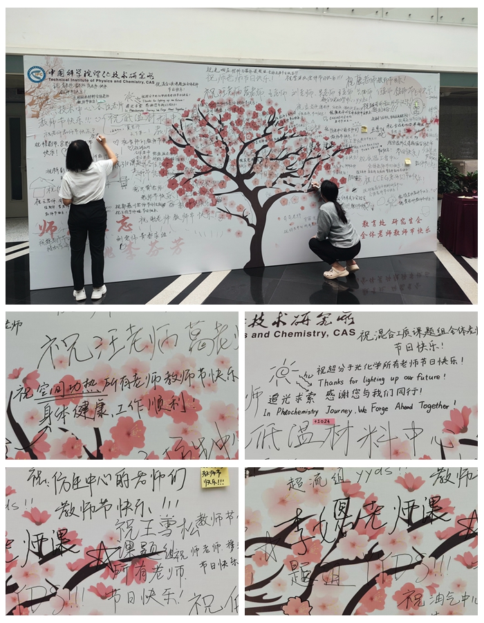 此外,教育处联合研究生会组织策划了一系列教师节送祝福活动。教育处为每位导师精心挑选了《导师论导》和《研究生导师心理育人实用指南》两本书籍作为教师节礼物。理化学子则是用实际行动,结合自由多样的表达形式,向全所教师送上诚挚的祝福,道出心底无尽的感谢。此次活动为构建和谐师生关系增添了浓墨重彩的一笔,也让所内教师度过了温暖、难忘的一天。