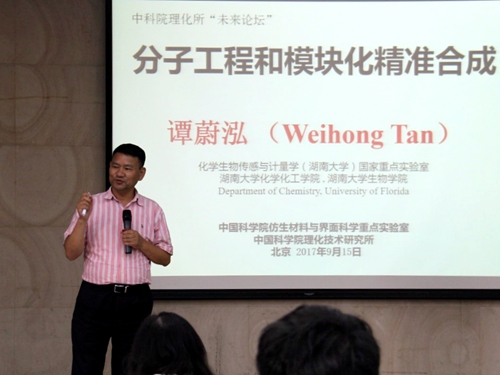 应理化“未来论坛”和中科院仿生材料与界面科学院重点实验室邀请,湖南大学谭蔚泓院士于9月15日下午来理化所交流访问,并作了题为“分子工程和模块化精准合成”的精彩报告。