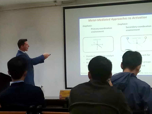 报告中,Nathaniel Szymczak教授首先介绍了其团队开发的一种脱氢催化剂,该催化剂能够在温和的反应条件下有效脱除醇和胺中的氢原子,进而发展了生物乙醇转化为正丁醇的高效转化。此外,近年来含重氢类药物在改善药物代谢动力学方面受到持续关注,Szymczak教授团队将D2O作为氘源,在氢转移催化过程中,通过修改一系列含有不同的空间定位的配体,改善供体和受体特性,制备出一类立体保持性良好的含重氢的手性胺催化剂,有良好的应用和发展前景。报告结束后,现场科研人员和同学就感兴趣的问题与Szymczak教授进行了热烈讨论。
