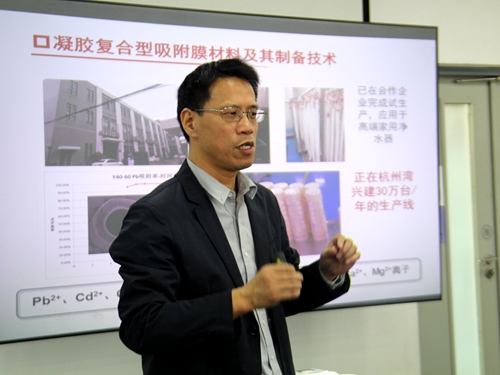 报告中,朱利平副教授首先简述了传统聚合物膜材料的研究现状,之后详细介绍了针对聚合物分离膜的复合改性这一前沿问题的研究进展:发现了聚多巴胺沉积层具有纳滤分离特性,制备了可用于高价离子脱除和有机中性分子拆分的凝胶复合膜,建立了基于反应性双亲聚合物膜表面二次改性的新方法。报告内容丰富,讲解充满激情,给师生留下深刻印象。报告结束后,朱利平副教授与师生就聚合物膜材料改性与应用等问题进行了热烈讨论。