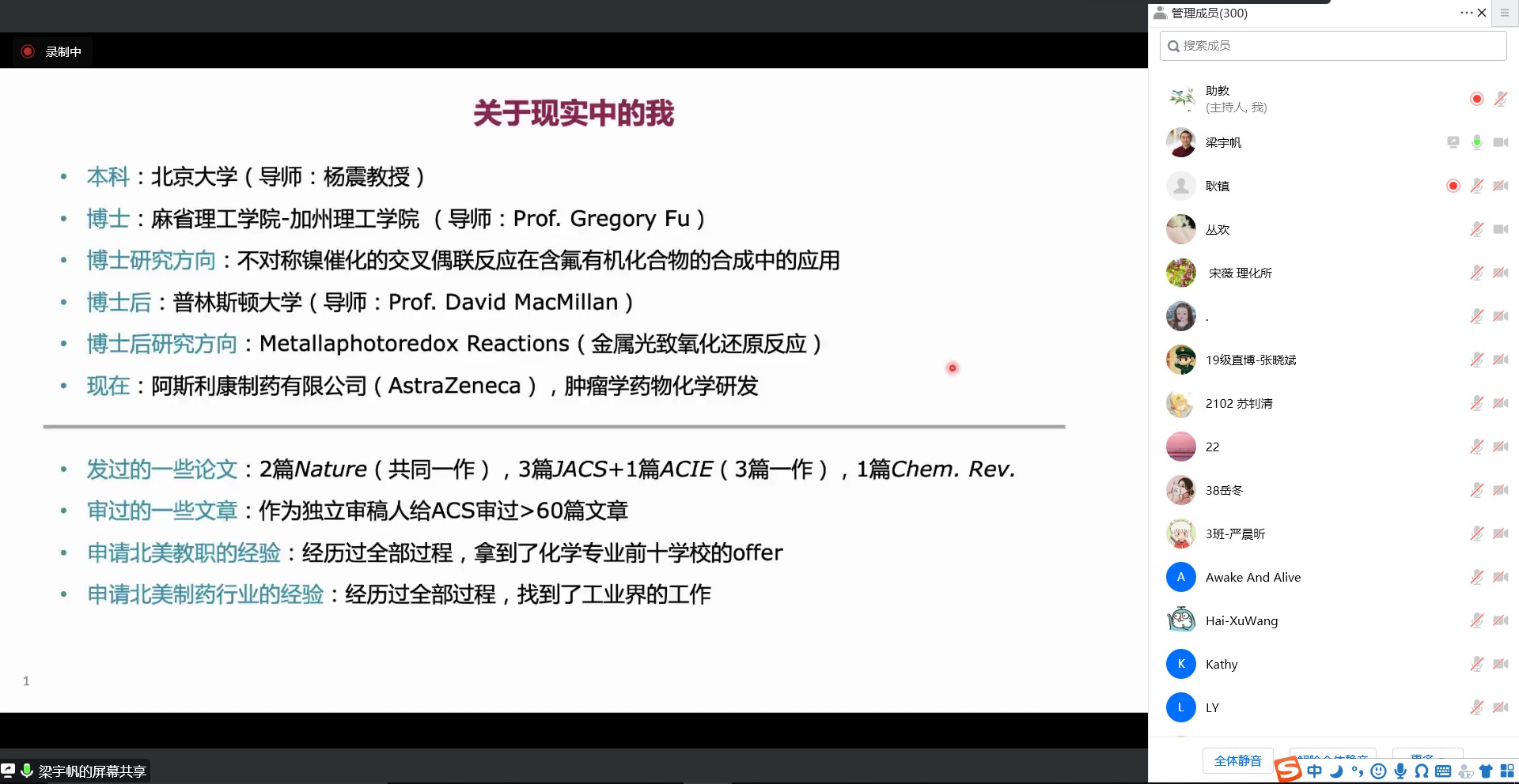 10月15日,未来·人文讲坛第十讲在线上举行,阿斯利康制药公司药物化学研发部高级科学家梁宇帆博士以“关于读博士和做科研---那些你希望知道,但是可能没人告诉过你的事情”为题进行分享交流。讲座由丛欢老师主持。