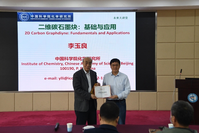 报告结束后,王树涛副所长为李玉良院士颁发了“未来科技大讲堂”纪念牌,和“讲座教授”聘书。李玉良院士的报告图文并茂,内容充实,条理分明。参会老师和同学反响热烈,并与李玉良院士进行了积极的交流讨论。