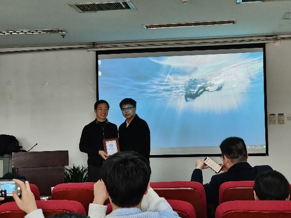 报告结束后,任斌与参会师生就纳米分辨针尖增强拉曼光谱技术进行了深入的交流。任斌教授的报告条理清晰,内容丰富,有很强的启发性。最后,张铁锐研究员为任斌教授颁发了“未来科技大讲堂”纪念牌。