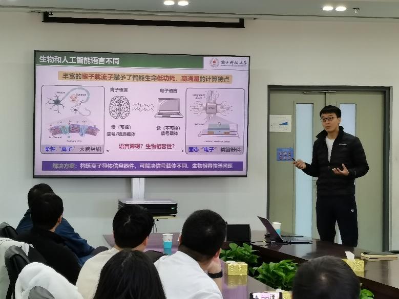 离子在智能生命体中至关重要,神经细胞中动作电位的产生、植物细胞光合作用、皮肤的压力感知等都和离子的定向传输密切相关。如何构筑基于离子传输的类脑计算器件,从而架起智能生命和仿生体系的桥梁,是未来面向脑-机混合智能的一个重要挑战。肖凯围绕“神经仿生材料、类脑计算器件、神经调控技术”这一主题进行讲述,通过仿生手段构筑了一系列离子传输材料,通过调控其结构和界面性质,探究了限域空间/界面内可控离子传输的机制,实现了类脑的多种脉冲放电功能。在此基础上,构筑以“离子”为语言的类脑计算硬件,并搭载新型神经计算软件,实现了低能耗、高通量的感存-算一体化功能;最后,验证了以“离子”为语言的类脑计算器件用于生物信号/信息调控和“人工智能生物智能”无障碍沟通。