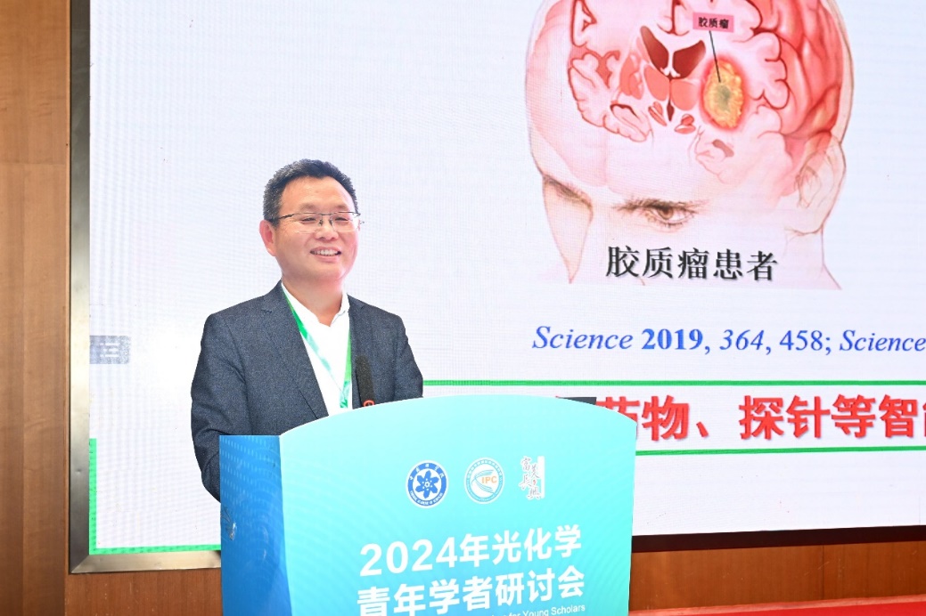 彭孝军院士作题为《荧光染料:从靶标识别到肿瘤诊疗》的报告。他介绍了多种荧光染料的发展历程,阐述了其在生物成像、靶标识别、肿瘤诊断与治疗中的应用。他的报告深入浅出,为大家生动展示了光化学与生命科学、医学的深度交叉,以及面向人民生命健康的创新前景。