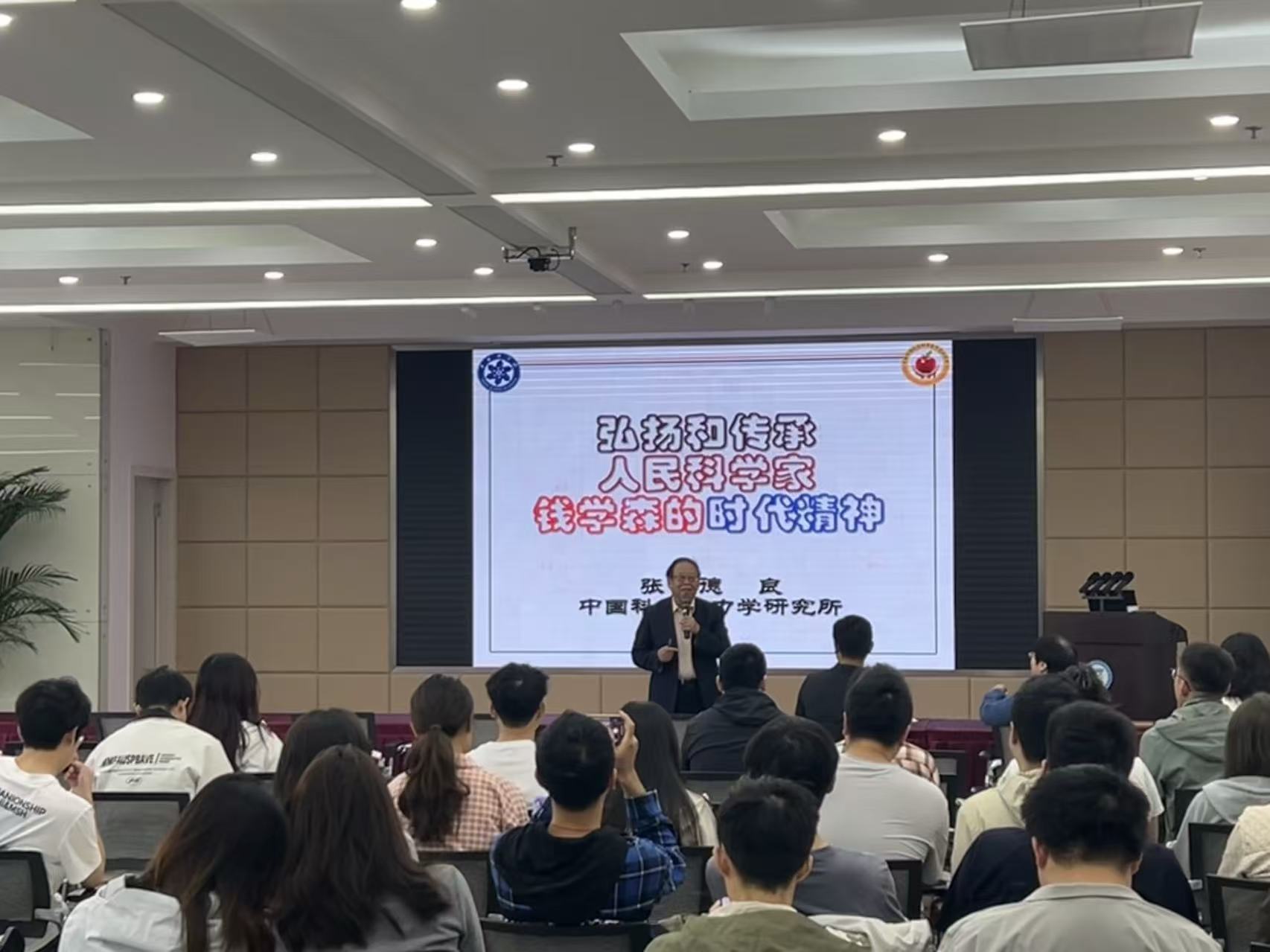 作为钱学森先生的学生,张德良首先介绍了钱学森先生早年留学美国,在空气动力学、火箭技术、工程控制论领域取得的瞩目成就,并讲述了他如何突破重重障碍毅然回国,投身“两弹一星”工程建设,带领团队研制导弹、原子弹、人造卫星等。如今,我国已构建起“三位一体”战略威慑体系,深刻印证了钱学森先生作为“中国航天之父”为我国航天和军工事业奠定的坚实基础,更彰显了钱学森精神对当代国防科技发展的深远影响。接着张德良深情讲述了钱学森先生在中国科学技术大学任教期间的事迹。钱学森高度重视科技人才培养,亲自延聘名师,夯实学生理论基础与工程能力,培养大批尖端人才,其“严格、严谨、严密”的作风影响着一代又一代科研工作者。最后,张德良激励同学们学习钱学森的时代精神,向科技创新进军,勇于探索、严谨务实、报效祖国。