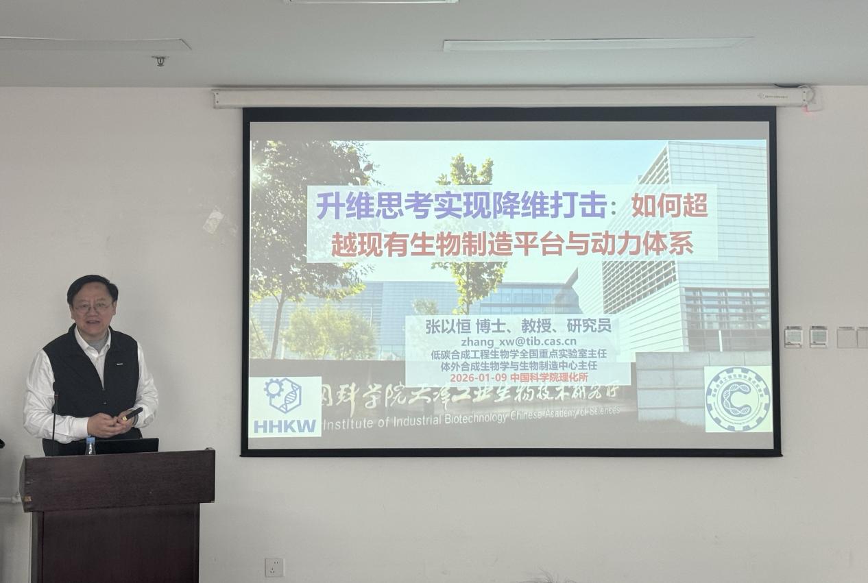 1 月 9 日,应 “未来青年论坛”和低温科学与技术全国重点实验室邀请,低碳合成工程生物学全国重点实验室主任、体外合成生物学与生物制造中心主任张以恒教授来到理化所交流访问,并作题为 “升维思考实现降维打击:如何超越现有生物制造平台与动力体系” 的学术报告。