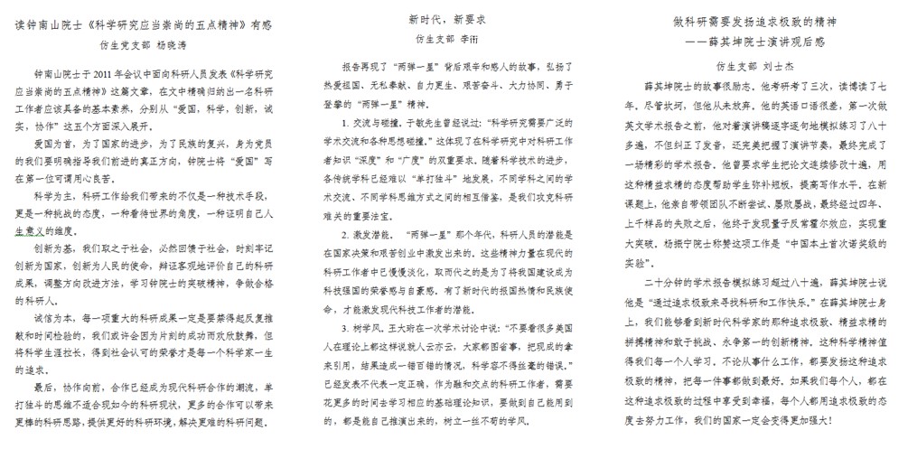 同时,这次主题党日活动还以党小组的形式,开展“诵读科学经典,弘扬科学精神”的活动。各位党员积极参加、响应热烈,通过对钟南山院士、马祖光院士、钟群鹏院士、薛其坤院士等科学家精神的学习,发表和分享自己的感想和心得。大家纷纷表示在心灵上受到了极大的震撼,在以后的科研生活中要铭记并弘扬科学精神,努力为国家做贡献。
