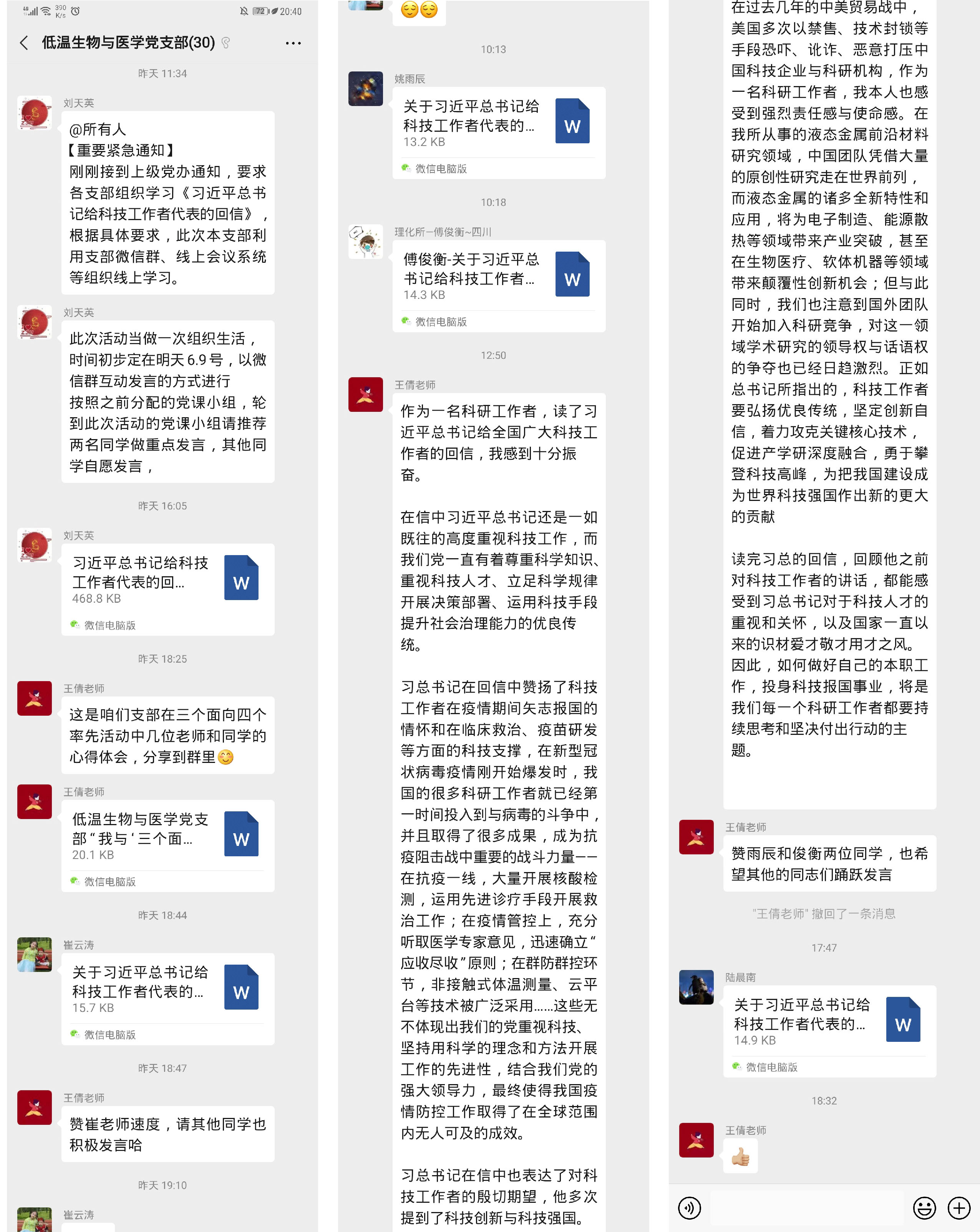 6月9日,低温生物与医学党支部开展了“学习《习近平总书记给科技工作者代表的回信》精神”组织生活会,活动以微信群为平台开展学习讨论,支部党员把学习感悟分享到群里进行交流学习。