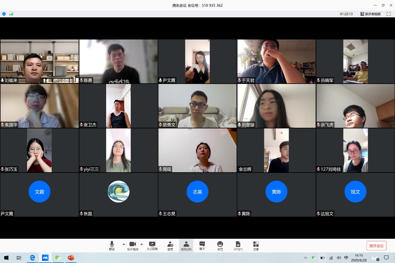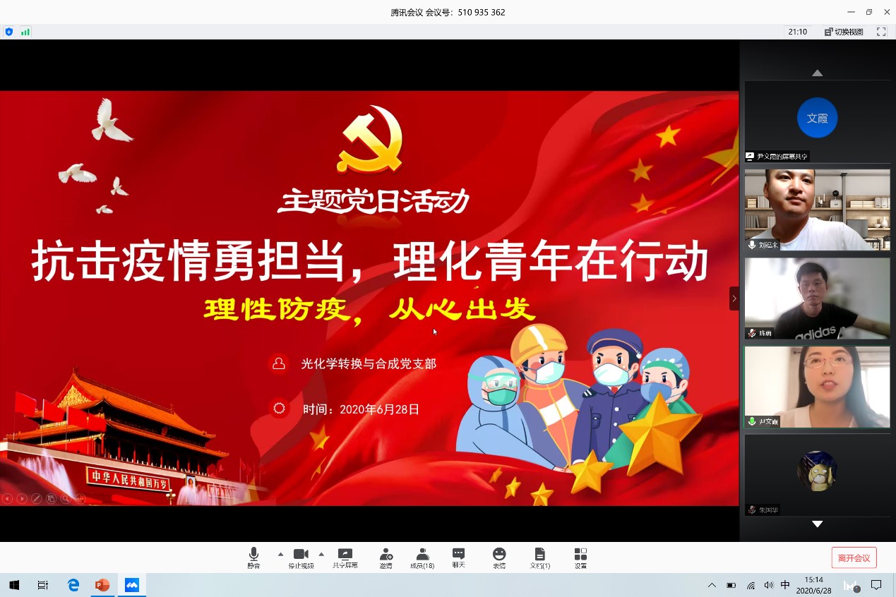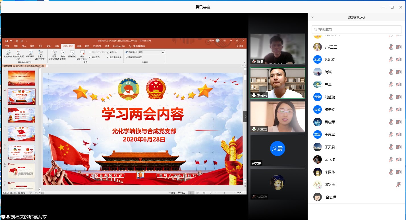 6月28日下午,光化学转换与合成党支部召开支部党员大会,组织“2020全国两会精神解读”专题党课学习和开展“抗击疫情勇担当,理化青年在行动”主题党日活动。会议由支部组织委员尹文霞同志主持,支部全体党员、积极分子等近二十人在线参加会议。