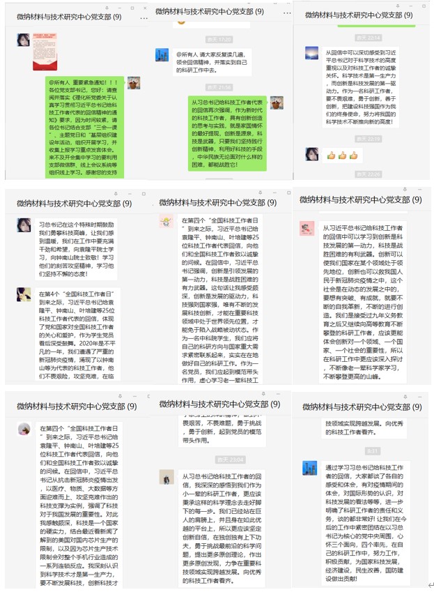 组织委员田华首先将《习近平给袁隆平、钟南山、叶培建等25位科技工作者代表的回信》发到群里供大家阅读讨论,鼓励大家积极分享自己的学习体会。贺军辉书记对本次学习提出指导意见,要求大家反复读几遍,认真领会回信精神,并落实到自己的科研工作中去。中心9名党员全部参与讨论学习,并分享了各自的学习心得体会。