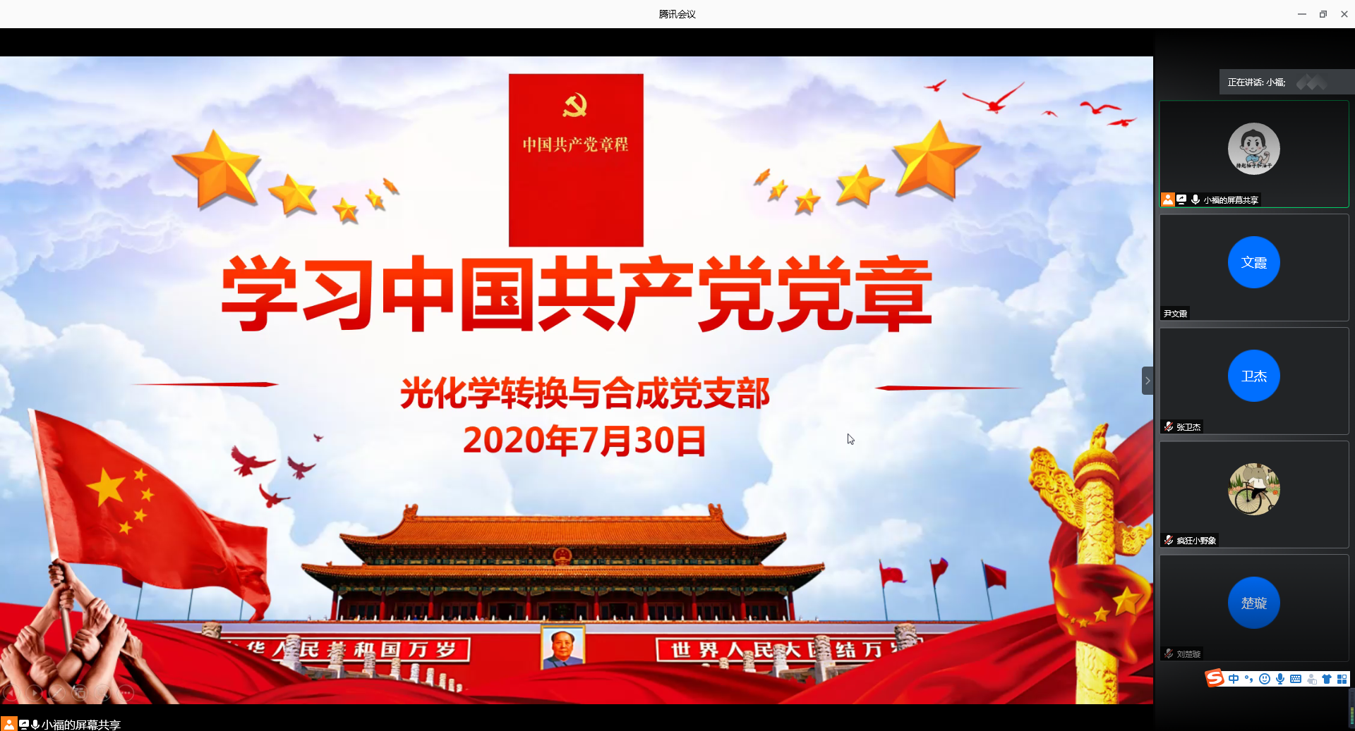 7月30日下午,光化学转换与合成党支部召开支部党员大会,组织学习中国共产党党章,并开展“不忘初心,弘扬优良家风”主题党日活动。会议由支部书记陈勇同志主持,支部全体党员、积极分子等近20人在线参加会议。