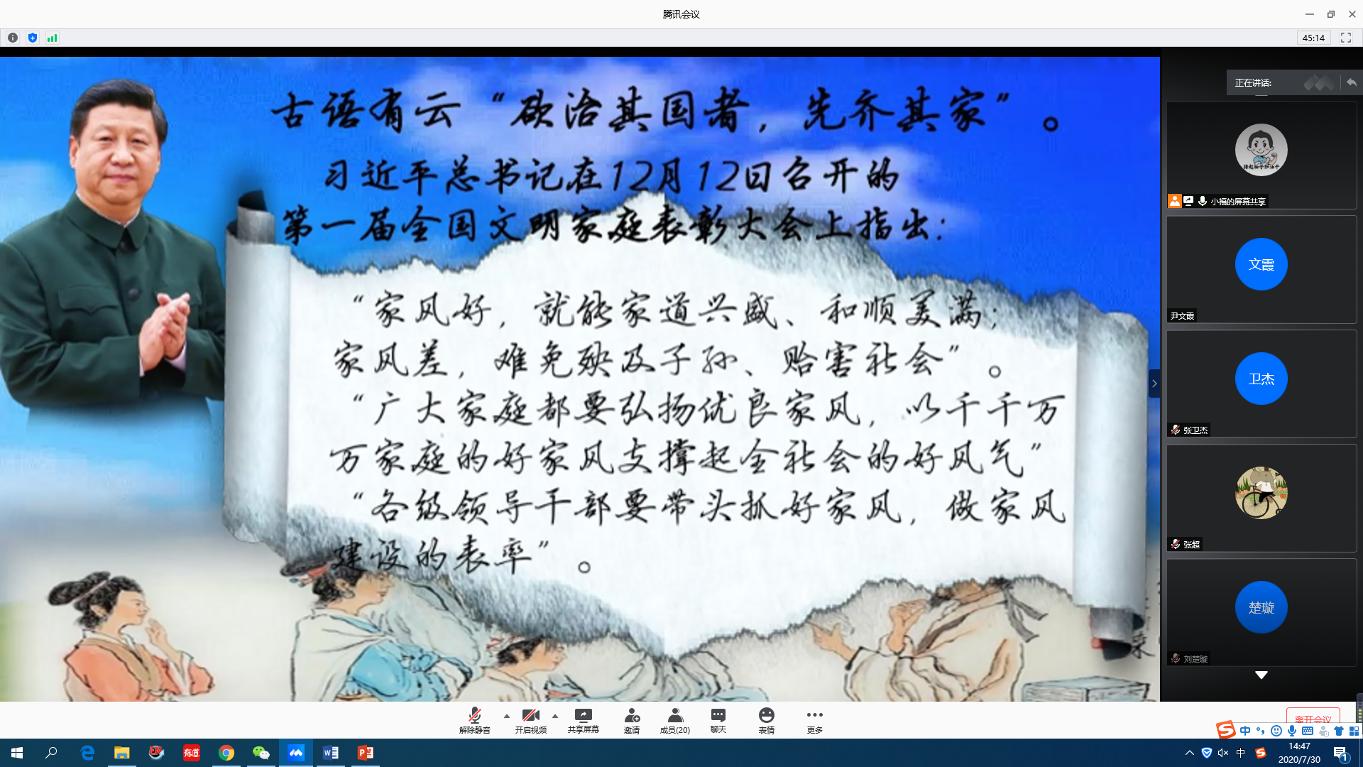 随后,党支部的同志踊跃发言。刘楚璇同志讲述了“人自助,家人才能助之”的家训;黄陈同志从父亲的言传身教中感受到了晚辈孝顺长辈的家风传承;尹文霞同志分享宋朝名臣晏殊、范仲淹、苏洵等家风故事,从家引出国家,家是最小国,国是千万家。陈勇同志提出了民主平等,遇事自己做决定,自己负责的家庭教育理念。刘福来同志讲述了“成才先成人”的家风传承;王志昊同志从自身家庭家风学习中形成了孝敬老人、尊敬长辈、见到长辈要问好、不浪费粮食的优秀品质。最后,陈勇同志总结发言,指出家风是一个家庭的精神内核,良好的家风才能让一个家族源远流长、薪火相传。实验室也是一个大家庭,也需要弘扬优良的家风。