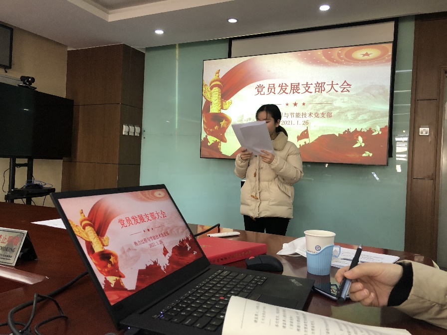 1月26日,热力过程与节能技术研究中心党支部召开党员发展大会,讨论接收发展对象许浩、田亚玲为预备党员以及预备党员陈伊宇转正事宜。会议由组织委员孙郁主持。