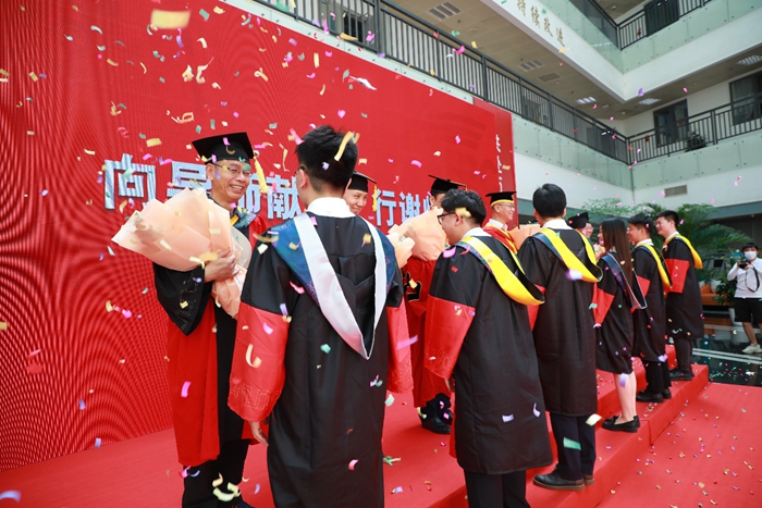 伴随着激昂的音乐,所领导、导师代表为毕业生们颁发毕业证书,拨流苏,完成学位授予仪式。毕业生代表向现场导师献花并鞠躬行谢师礼,感谢导师们的一路指引与帮助,让学生们成长为更好的自己。