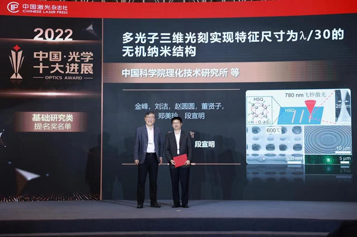 /30 Inorganic Features Achieved by Multi-Photon 3D Lithography” Nature Communications (2022)13:1357)荣获“2022中国光学十大进展”提名奖(基础研究类)。论文作者为金峰、刘洁、赵圆圆、董贤子、郑美玲、段宣明,金峰副研究员为第一作者,郑美玲研究员、段宣明教授为共同通讯作者。