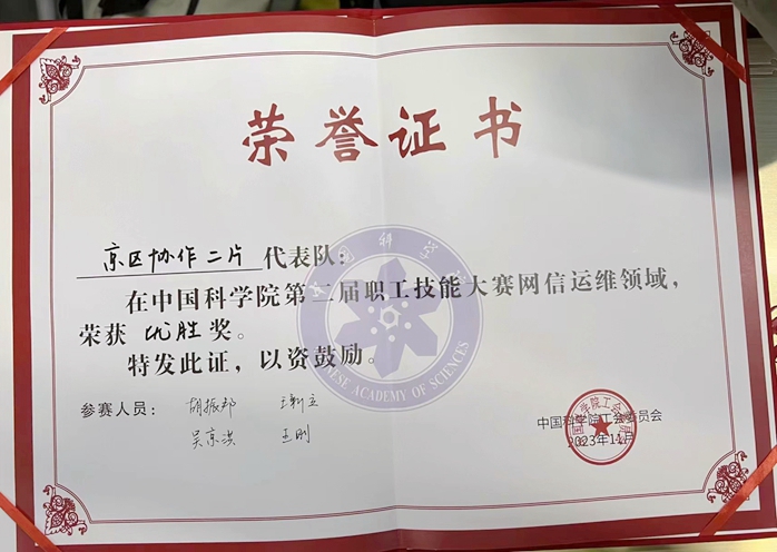 理化所王新立参加的京区协作二片代表队获中国科学院第二届职工技能大赛网络运维领域优胜奖