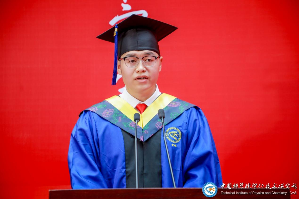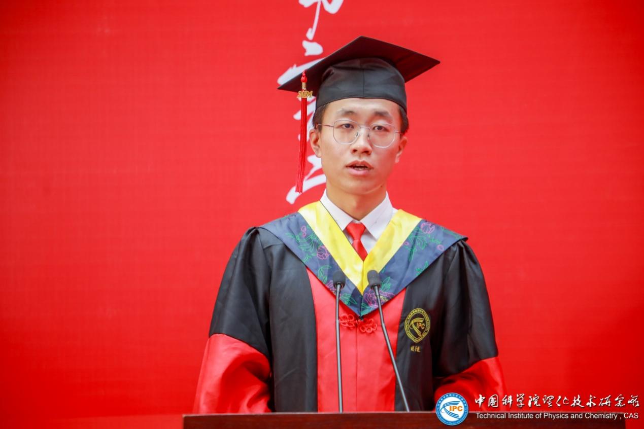 刘子健作为博士毕业生代表发言,他首先感谢母校、老师和家长的辛勤培育和支持,继而从与理化所结缘开始,回顾自己的五年博士生涯,希望和同学们一起怀揣梦想和追求知识,创造出属于自己的精彩人生。