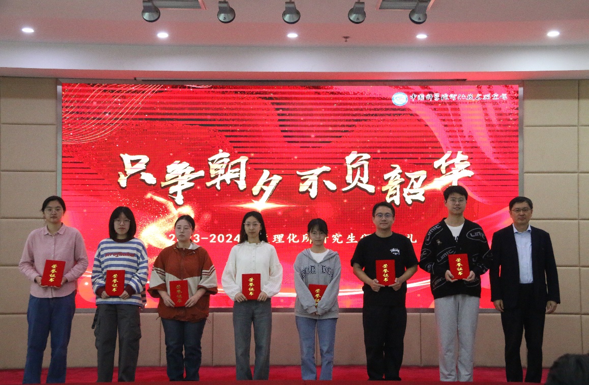 紧接着举行了年度研究生颁奖典礼,教育处处长丁黎对2023-2024学年研究生获奖情况进行通报,党委书记王树涛为获得国家奖学金、中国科学院院长特别奖、院长优秀奖、国科大三好学生标兵以及优秀学生干部等奖项的获奖代表颁发了荣誉证书,并与全体获奖代表合影留念。2024年中国科学院院长优秀奖获得者徐雪涛同学代表获奖学子发言,他结合自身成长学习经历,鼓励新入所的师弟师妹们在未来的科研生活中保持积极热情的心态,在学习的过程中不断总结提升自我,同时在科研与生活中寻求平衡,祝愿大家在所里收获一段充实且快乐的研究生时光。