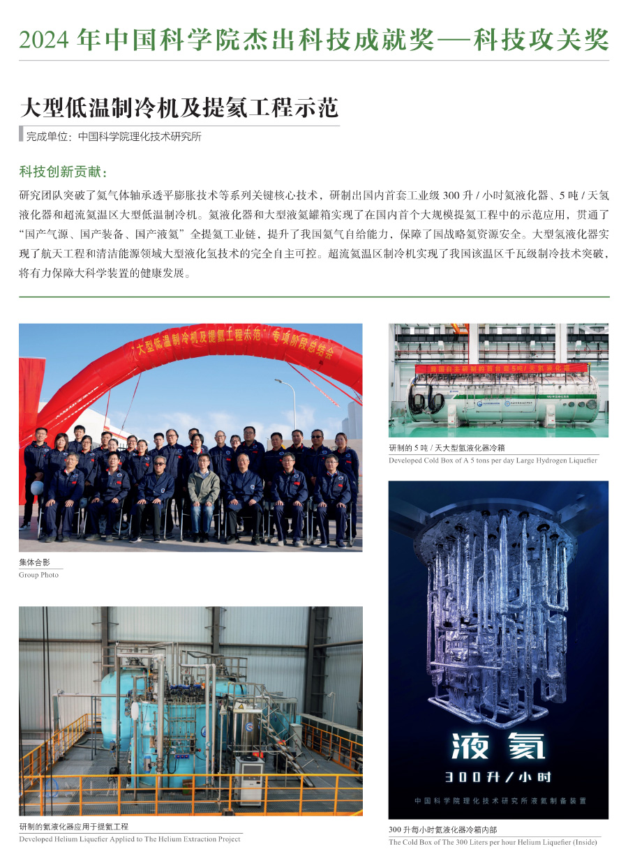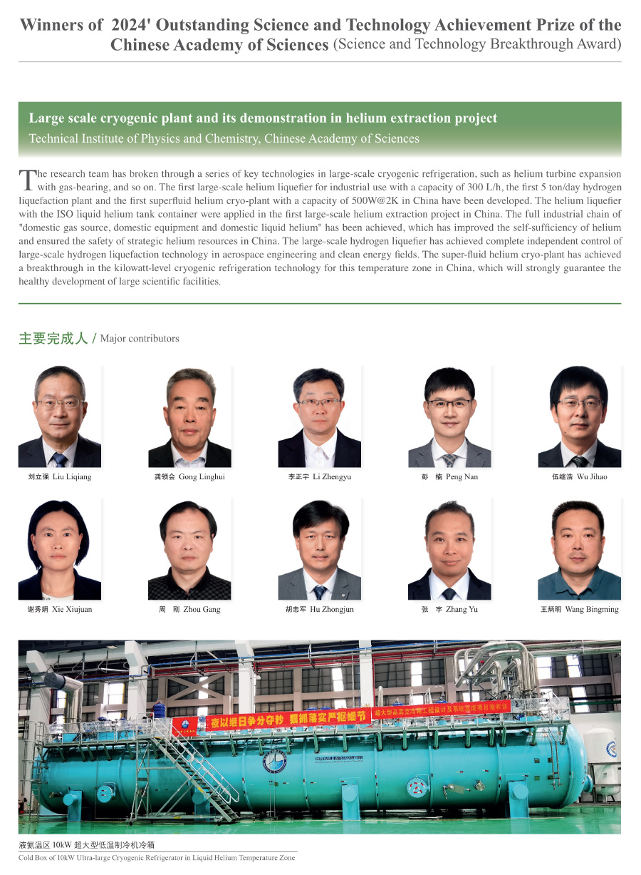 1月16日,2024年度中国科学院杰出科技成就奖颁奖仪式在京举行。中国科学院院长、党组书记侯建国颁奖,副院长、党组副书记吴朝晖宣读表彰决定,共2人获个人成就奖,4项成果获基础研究奖,5项成果获技术发明奖,5项成果获科技攻关奖。理化所成果“大型低温制冷机及提氦工程示范”荣获科技攻关奖。