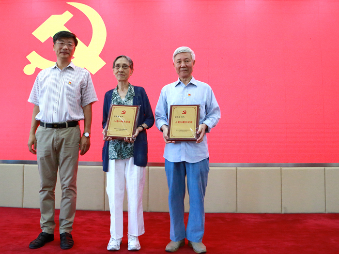 为表达党组织对老党员的认可和感谢,本次庆祝活动延续了在党的生日向党龄满50周年的老党员颁发纪念牌的仪式,党委书记王越超代表所党委向战师荣、郝玉清两位老同志发放纪念牌并合影留念。此项仪式已在理化所传承10余年。这些老党员虽年事已高,但只要健康状况允许,都坚持亲自来领纪念牌。接过纪念牌的一刻,他们的脸上写满了自豪与荣光。