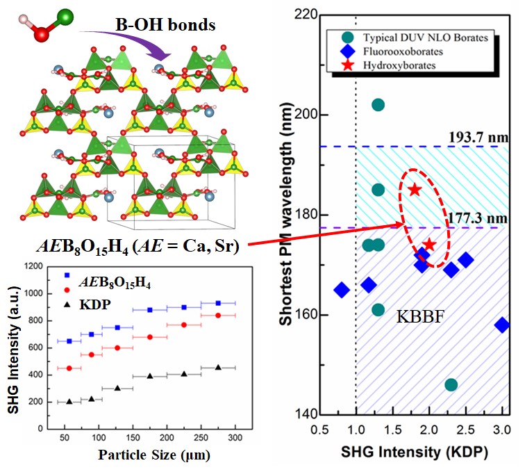 近日,按照此设计蓝图,林哲帅研究员、康雷博士以“Realizing deep-ultraviolet second harmonic generation by first-principles-guided materials exploration in hydroxyborates”为题,在Journal of the American. Chemical Society上发表文章,将深紫外非线性材料研究推进到羟基硼酸盐体系,从第一性原理出发系统评估了羟基硼酸盐所呈现出的潜在深紫外非线性光学性能,发现了羟基硼酸阴离子基团可以呈现媲美氟硼酸阴离子基团的深紫外非线性光学性能,设计了ABOH深紫外非线性光学结构,并分析了系列羟基硼酸盐材料的晶体结构与非线性性能的演化规律。同时,在理论分析和预测的指导下,通过实验获得了从无机晶体数据库中筛选出的两种碱土金属羟基硼酸盐化合物,即AEB8O15H4 (AE = Sr, Ca)。初步的实验测量包括粉末吸收光谱和倍频效应与理论计算结果吻合,较好地证实了理论的预测,即其具有较大的晶体带隙,较强的倍频效应和足够的双折射率,因而其理论上可以实现最短174纳米和185纳米的深紫外相位匹配倍频输出。这是首次证明羟基硼酸盐能够呈现出一定的深紫外非线性光学性能。其能否作为深紫外非线性光学晶体候选材料,还需进一步落实到大尺寸晶体生长和更严格的光学表征上。后续研究正在开展之中。