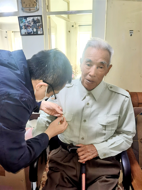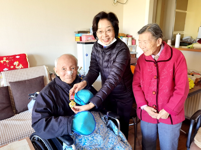 张丽萍书记一行对老同志们嘘寒问暖,与他们亲切交谈,认真倾听他们入朝作战、服务、恢复生产的革命往事。张丽萍书记还为王建平老师佩戴“中国人民志愿军抗美援朝出国作战70周年纪念徽章”。