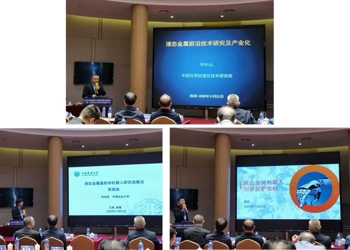 之后,中国农业大学何志祝特聘研究员做了《液态金属基软体机器人研究进展及其挑战》的深度主题报告。他首先回顾了液态金属软体机器人的发展历程,对这一新兴领域的代表性进展进行了较为系统的归纳,并在讲解中穿插分享了自己课题组的最新研究成果,为与会者展示了一种独特的磁控蠕动机器人,报告最后对未来液态金属机器人的发展方向提出了自己的见解。其后,四川智百荟知识产权服务有限公司袁林总经理做了《液态金属机器人创新保护策略》主题报告,针对如何利用专利保护原始创新进行了精彩的分享,报告结合具体实例说明了专利的价值,指出了专利布局的重要性。最后,中科院理化所邓中山研究员全面介绍了一系列源自中国的富有代表性的液态金属前沿技术。他系统回顾了中国在发展液态金属全新工业、创建液态金属谷等方面的经验和产业化历程,并对若干正逐步进入规模化应用的液态金属前沿技术产品进行了重点介绍。报告主题不一,内容丰富,为与会者呈现了一场学术盛宴。