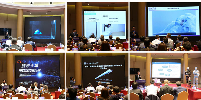 开幕式后,会议邀请液态金属前沿技术与柔性机器人相关领域的知名专家做大会报告。报告内容涉及广泛,涵盖了当前技术现状、未来发展趋势以及面临的挑战等。刘静研究员做了《可变形液态金属机器人:从理论到现实的演化》的精彩报告,高屋建瓴地对液态金属软体机器人理论与技术进行了全面讲解,他特别从自然界生命演化的角度比拟指出了液态金机器人的发展方向和路径,并剖析了液态金属在其中所发挥的关键作用,最后总结提出了液态金属柔性智能机器人领域的十类基础科学问题,引起了与会专家学者的广泛关注和讨论。大会的第二个报告来自华中科技大学的吴志刚教授,他从工程制造的角度,对液态金属三维表面印刷和植物操纵这一主题进行了精彩的阐述。最后,来自北京航空航天大学的文力教授做了题为《软体机器人:结构、驱动与系统》的富有启发性的大会报告,回顾了软体机器人的定义和发展,重点介绍了用于水下的气动机械手,指出了液态金属在感知方面所能发挥出的重要作用。