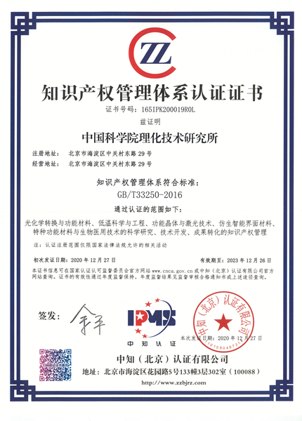 此次认证范围包括光化学转换与功能材料、低温科学与工程、功能晶体与激光技术、仿生智能界面材料、特种功能材料与生物医用技术领域的科学研究、技术开发、成果转化的知识产权管理,覆盖了理化所全部五大方向。